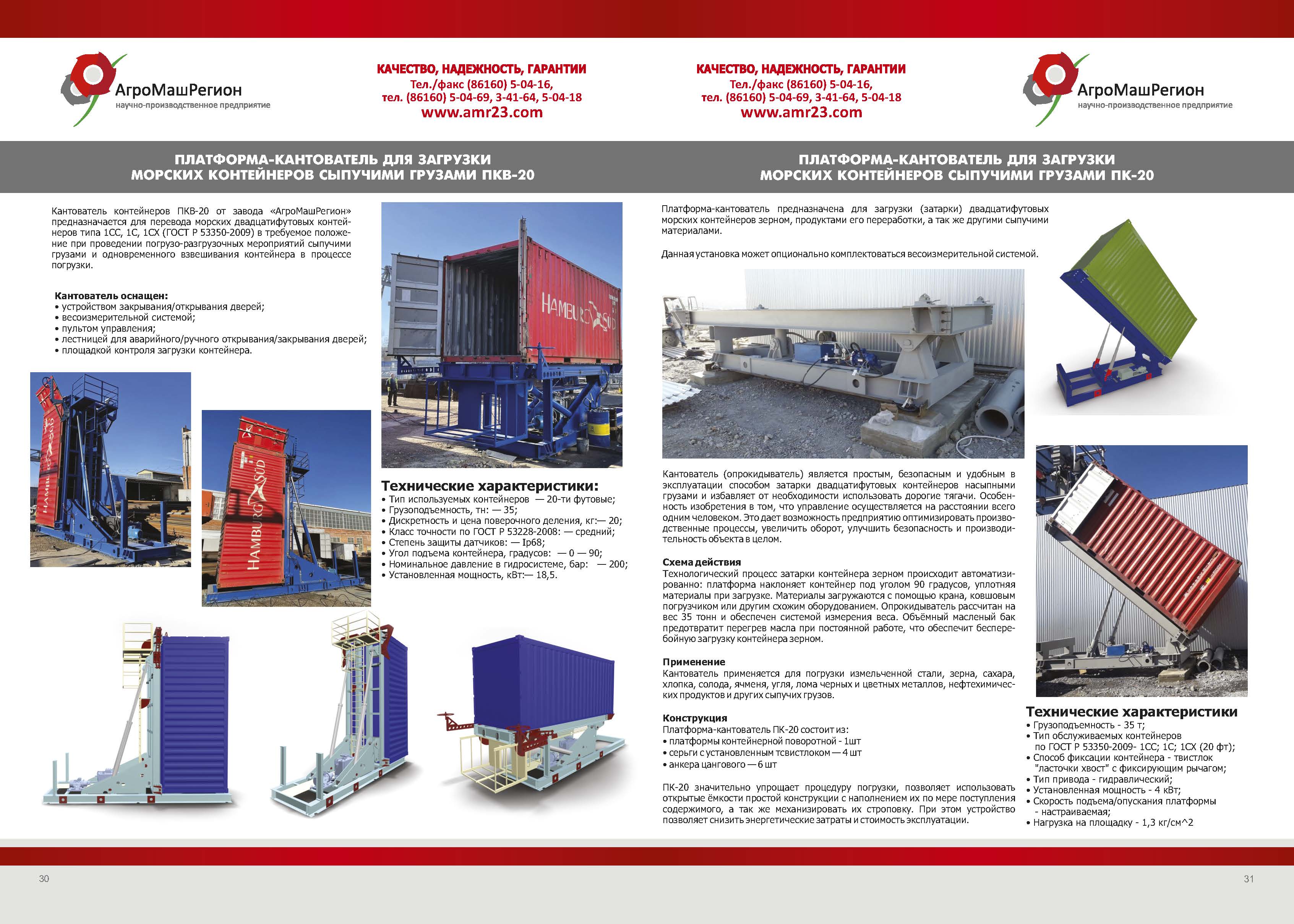 Кантователь контейнеров ПКВ-20 от завода «АгроМашРегион» предназначается для перевода морских двадцатифутовых контейнеров типа 1СС, 1С, 1СХ (ГОСТ Р 53350-2009) в требуемое положение при проведении погрузо-разгрузочных мероприятий сыпучими грузами и одновременного взвешивания контейнера в процессе погрузки.
