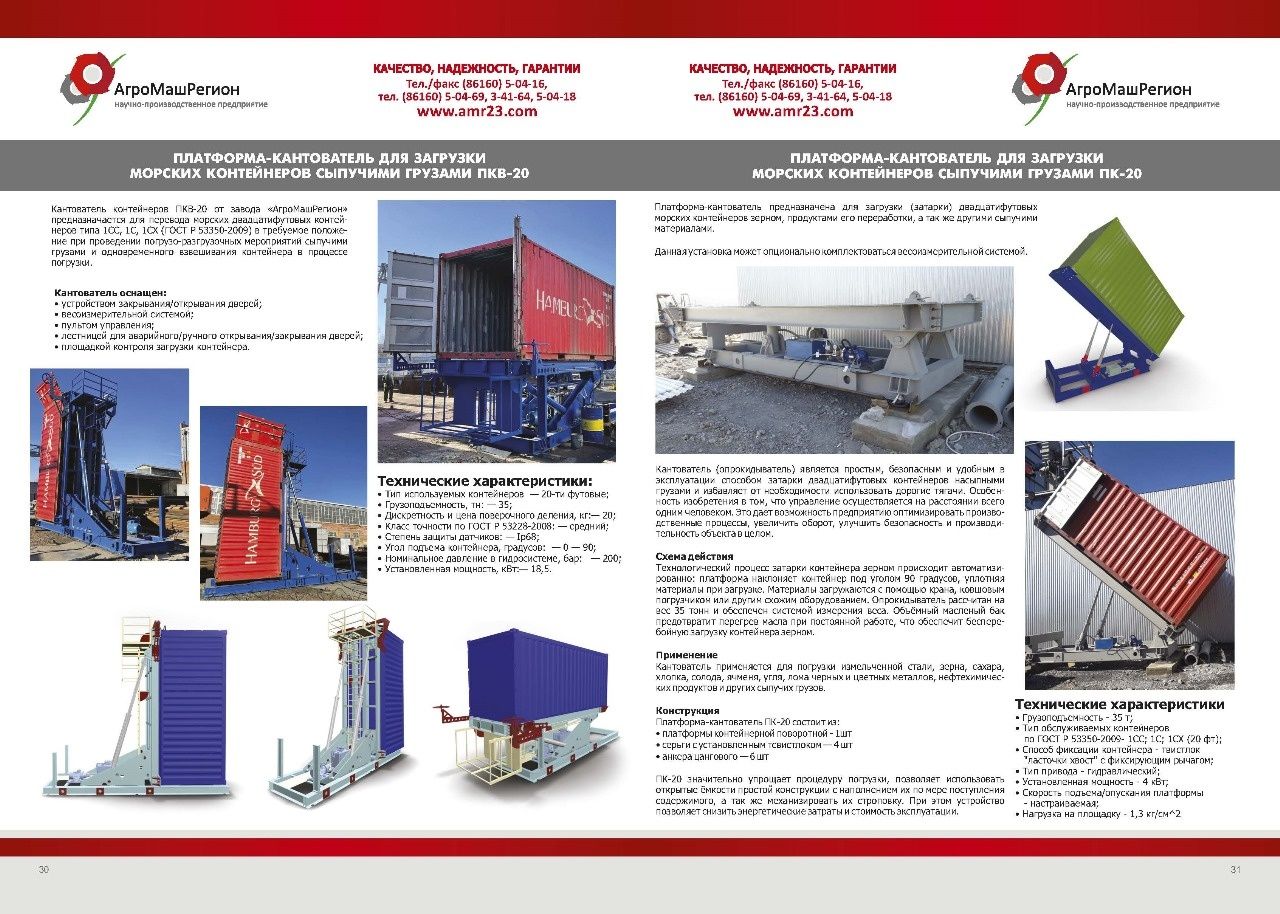 Кантователь контейнеров ПКВ-20 от завода «АгроМашРегион» предназначается для перевода морских двадцатифутовых контейнеров типа 1СС, 1С, 1СХ (ГОСТ Р 53350-2009) в требуемое положение при проведении погрузо-разгрузочных мероприятий сыпучими грузами и одновременного взвешивания контейнера в процессе погрузки.